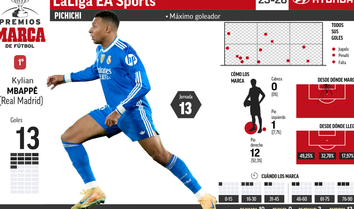 El fenómeno Kylian Mbappé está demostrando una vez más su calidad en el fútbol. Aunque lleva dos jornadas sin marcar, ¡no todo está perdido! El francés mantiene una ventaja de cinco goles sobre Robert Lewandowski, quien ha regresado con fuerza de su lesión, anotando cuatro dianas en sus últimos dos partidos. Actualmente, Mbappé tiene 13 goles en su cuenta personal.