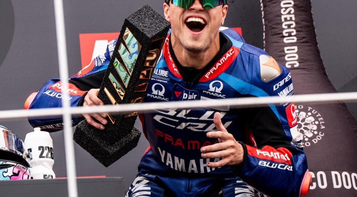 «Esto significa muchísimo para mí y para todo el equipo», confesó con una sonrisa iluminada por la felicidad. Agradeció a Yamaha y Pramac Racing por la confianza depositada en él. Con solo un año de vida, su equipo ha demostrado ser fuerte y capaz, al alcanzar esta victoria tras 22 intensas carreras. «Es una sensación increíble», continuaba emocionado. «Hemos trabajado muy duro y hoy somos un grupo fuerte que ha mostrado que podemos ganar». No olvidó mencionar a Gino Borsoi, quien siempre creyó en su talento y fue clave a lo largo de su carrera.