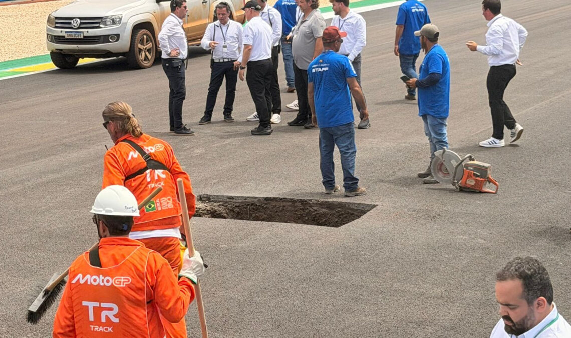 En un giro inesperado de los acontecimientos, el Gran Premio de Brasil de MotoGP se ha visto obligado a detenerse. ¿La razón? Un enorme agujero que ha hecho acto de presencia en plena recta de meta, una de las más largas del campeonato, con sus 994 metros. El renovado circuito de Goiânia está estrenándose en este Mundial y ya ha dado más sorpresas de las esperadas.