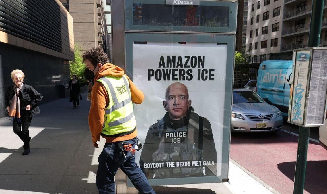 En estas pancartas no solo se habla de glamour. Se les señala directamente por su apoyo al ICE, el Servicio de Inmigración y Control de Aduanas, debido a los contratos que tiene Amazon con este organismo. Pero eso no es todo; también se denuncia la explotación laboral que muchos trabajadores sufren en los almacenes de Amazon. Es un recordatorio claro de que detrás del brillo hay una dura realidad.