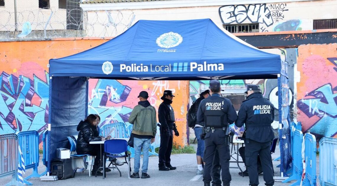 Desde bien temprano, a las siete de la mañana, un numeroso grupo de agentes de la Policía Local y técnicos de Asuntos Sociales se han instalado frente a la entrada principal de la antigua cárcel de Palma. Una carpa con mesas ha sido colocada para identificar a todas las personas que entran y salen del lugar. Entre tanto, un grupo de jóvenes, apenas en sus veintitantos, alzan la voz en protesta contra los periodistas: «¡No me grabéis, no tenéis mi consentimiento!», gritan al salir.