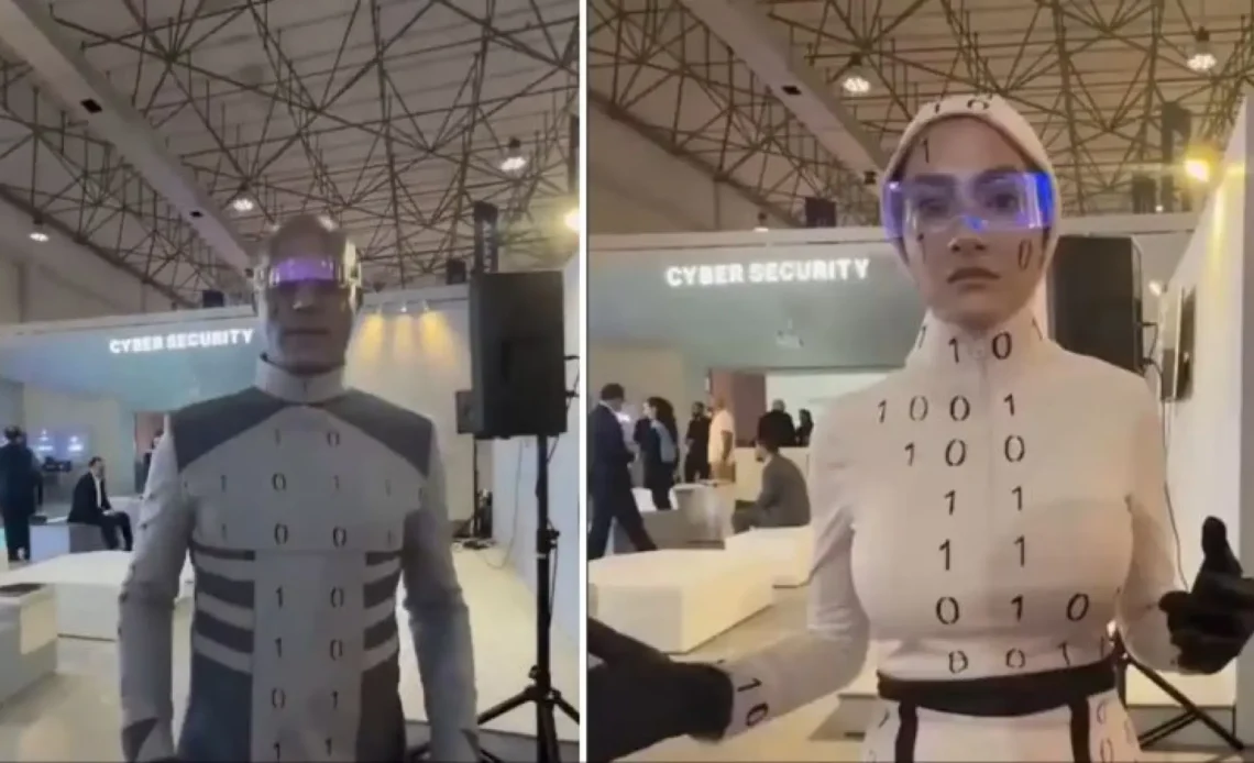 Imagina la escena: una feria tecnológica en Irán, la Kish Inox Tech Expo 2025. El lugar rebosaba de innovaciones y gadgets, pero lo que realmente captó la atención fue algo inesperado. Dos actores, vestidos con monos cubiertos de código binario y unas gafas semitransparentes, decidieron hacer su propia representación robótica. Lo que empezó como un intento de dar vida a la inteligencia artificial se transformó rápidamente en objeto de burla en las redes sociales.