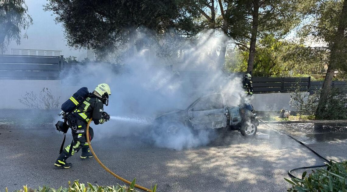 Apenas la mujer logró detenerse y hacer la llamada correspondiente cuando dos camiones bomba llegaron raudos desde el parque de Calvià, acompañados por patrullas de la Policía Local y Guardia Civil. Con agua y espuma hicieron todo lo posible para sofocar las llamas que habían convertido el Ford Ka en un amasijo humeante.